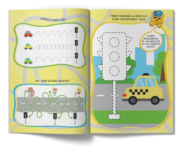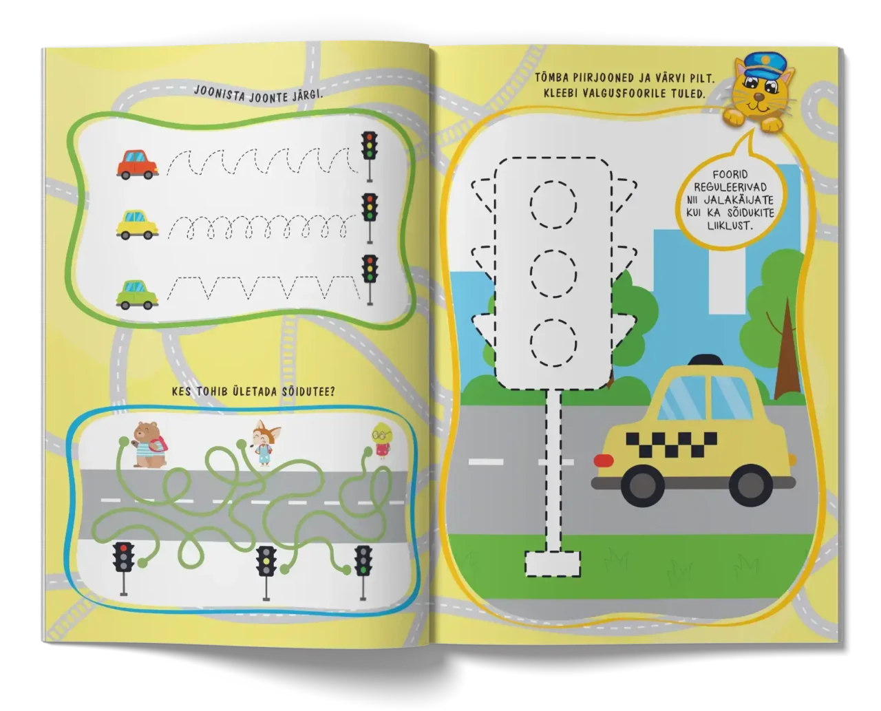 Mängulised ja eri raskusastmega värvimis-, kleepimis-, kirjutamis- ja nuputamisülesanded jagavad uusi liiklusteadmisi ja kinnistavad neid, mis juba omandatud.